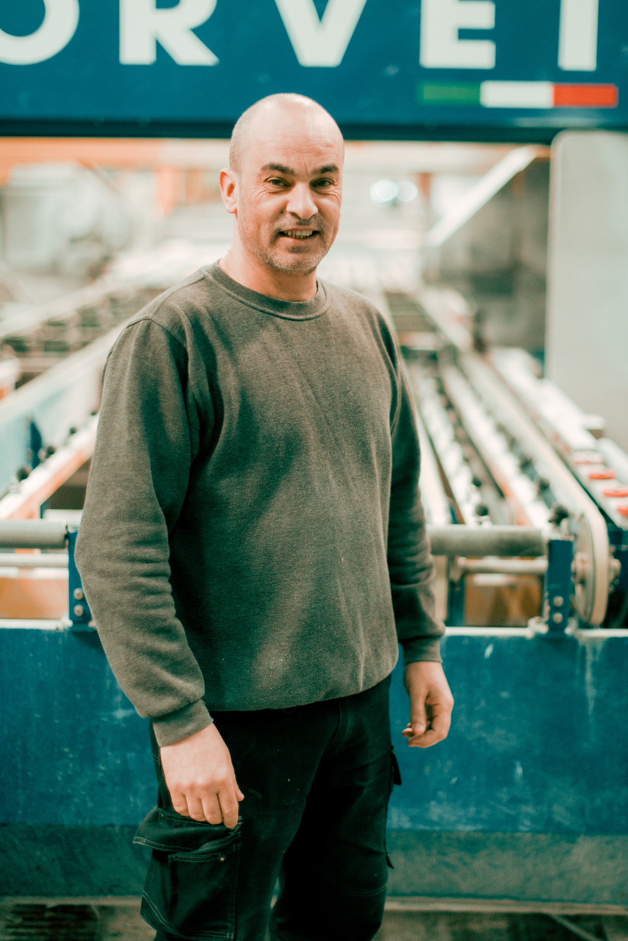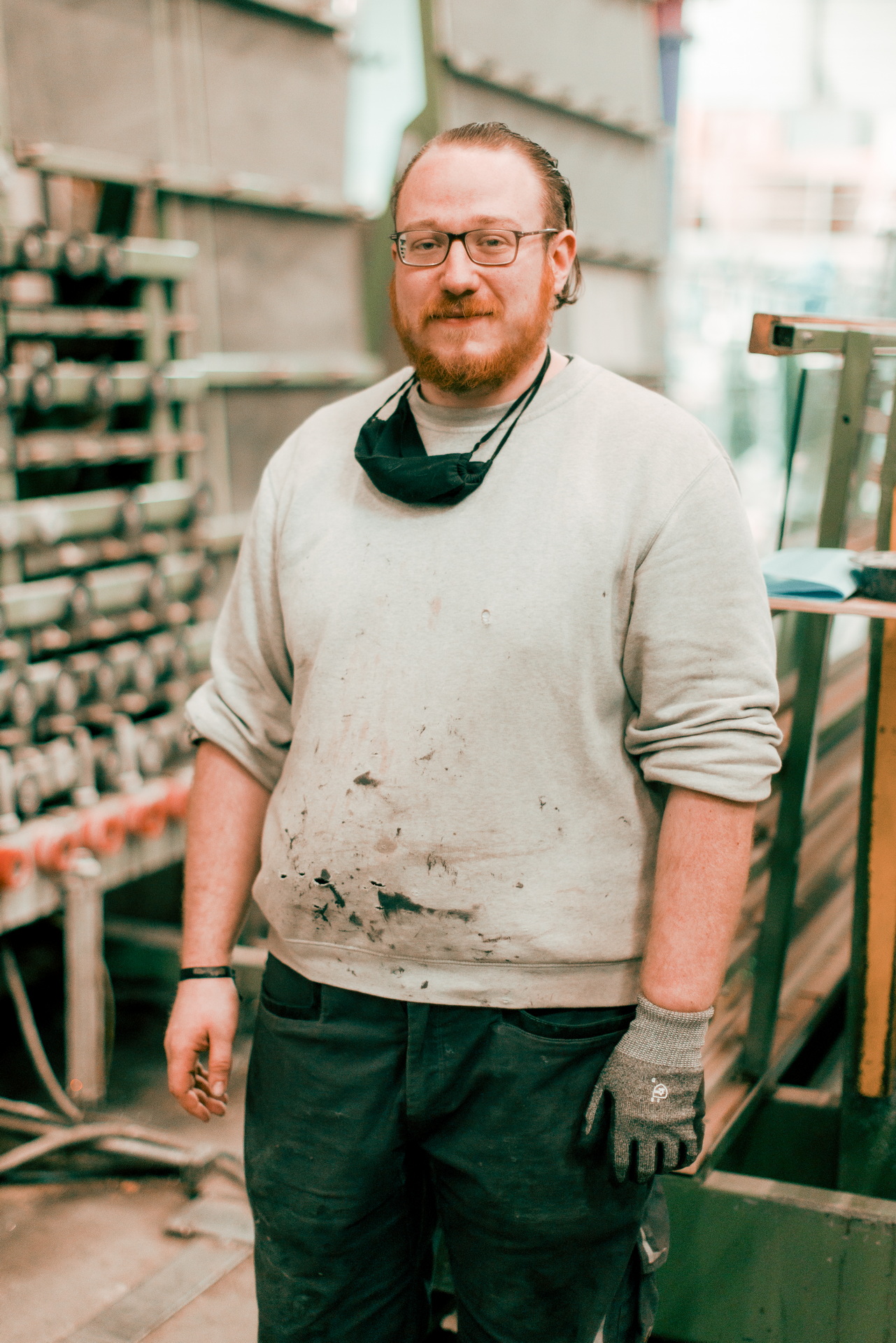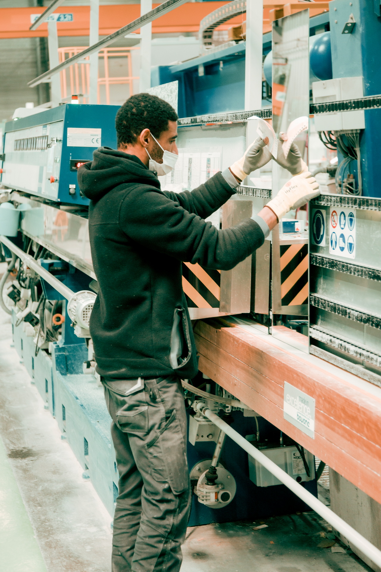 Dans la lumière de l’usine, les gestes s’enchaînent avec précision. Le verre, la matière, le bruit : tout devient rythme et savoir-faire.